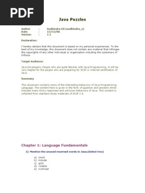 Wes munsil, president, lexonics, inc., acm computing reviews, september 29, 2005 If the solution that seems logical is wrong, you made a false assumption.categorize your assumptions, and try to identify those that are false. Tips to solve java programming puzzles and brainteasers 1. Which of the following creates an array of a generic type t which extends object. Don't be intimidated by complexity.